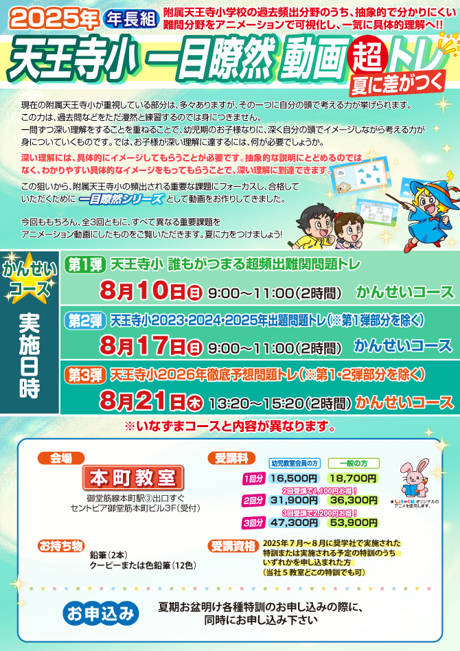 >  お盆明け特訓『天王寺小 一目瞭然動画超トレ かんせいコース』のお知らせ【本町教室】