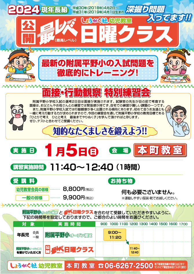 TOP >  【幼児部】トップ  >  1月5日(日)実施!『第5回 附属平野小オープン模試』のお知らせ【本町教室】