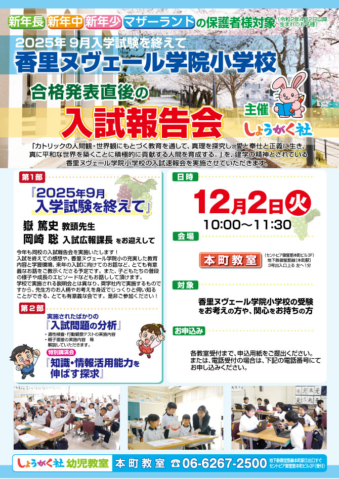 12月2日(火)実施!『香里ヌヴェール学院小学校 入試報告会』のお知らせ【本町教室】