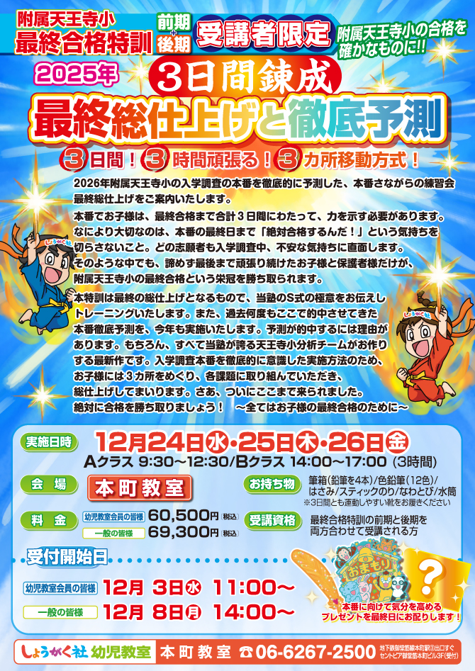 TOP >  【幼児部】トップ  >  2025年『3日間錬成 最終総仕上げと徹底予測』のお知らせ【本町教室】