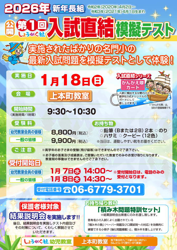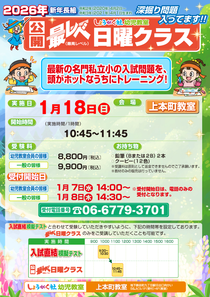 1月18日(日)同日開催!『第1回 入試直結年長模擬テスト』と『最レベ日曜クラス』のお知らせ【上本町教室】