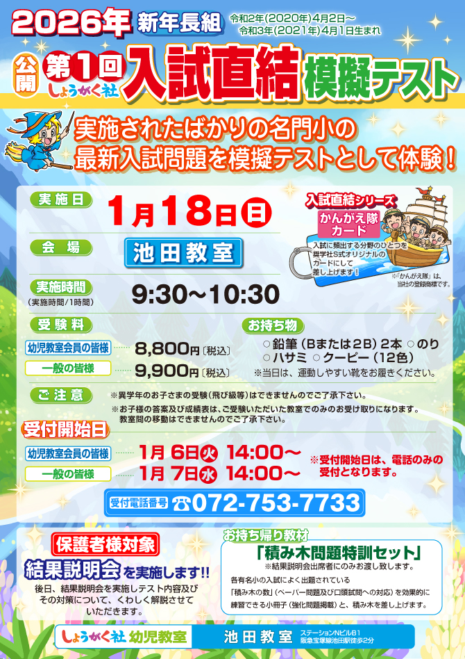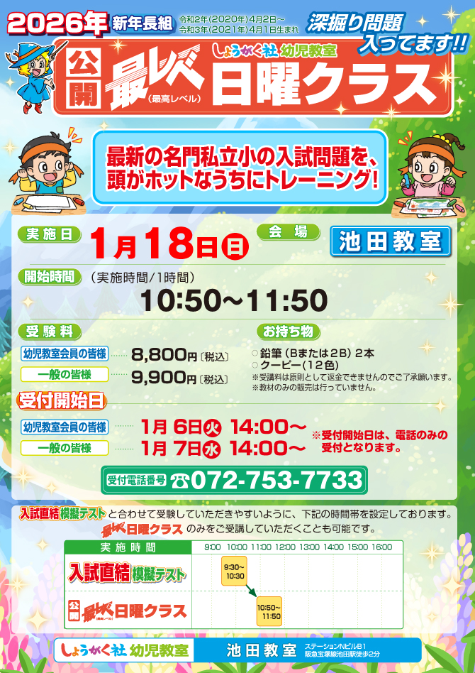 1月18日(日)同日開催!『第1回 入試直結年長模擬テスト』と『最レベ日曜クラス』のお知らせ【池田教室】 最レベ日曜クラスはこちら『入試直結年長模擬テスト』【池田教室】 『最レベ日曜クラス』【池田教室】