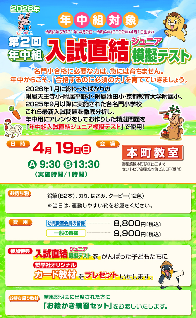 TOP >  【幼児部】トップ  >  4月19日(日)実施!『第2回 入試直結ジュニア模擬テスト』のお知らせ【本町教室】