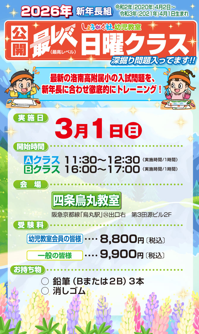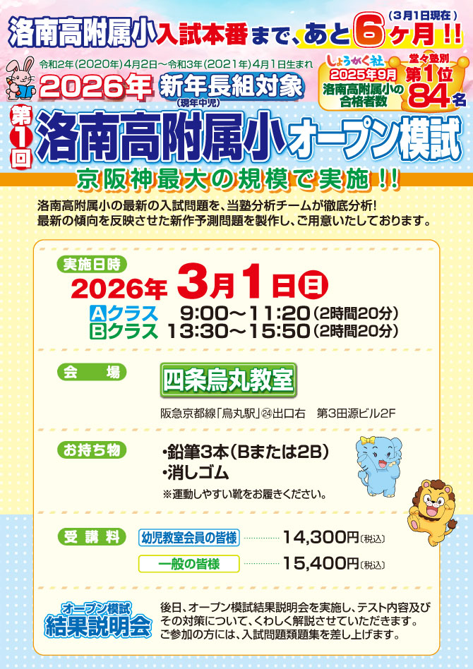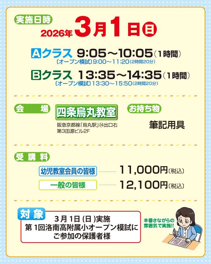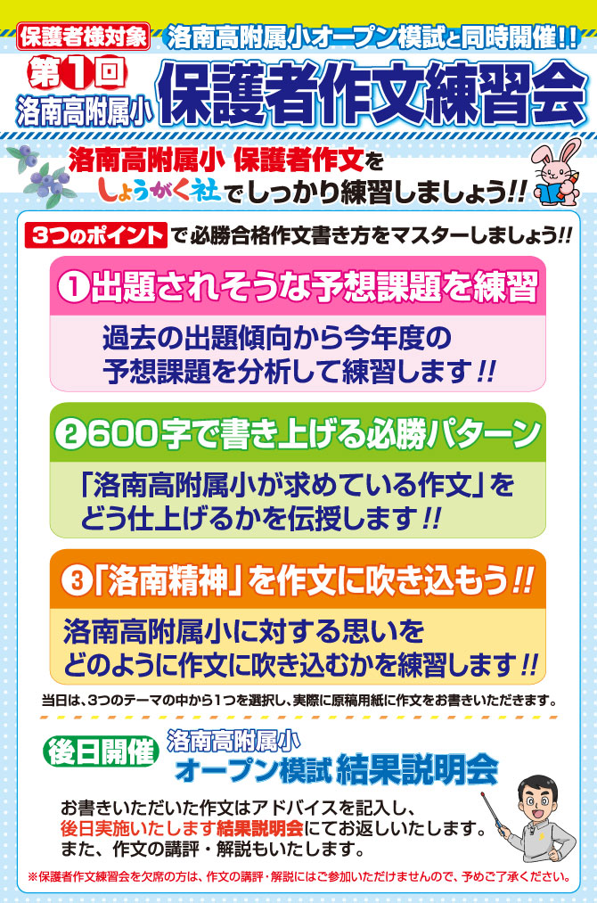 >  3月1日(日)同日開催!『第1回 洛南高附属小オープン模試』と『保護者作文練習会』のお知らせ【四条烏丸教室】