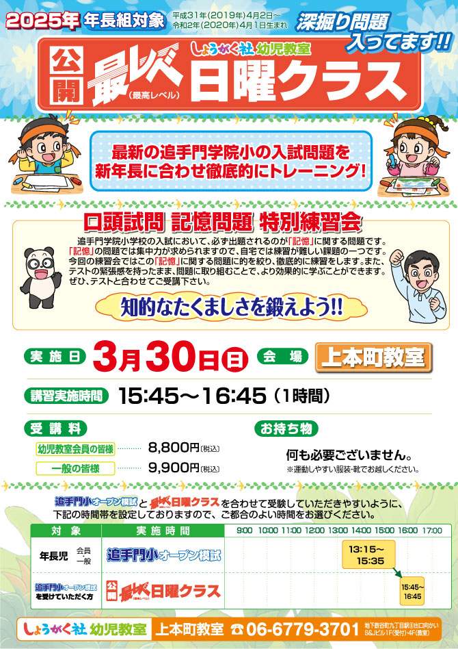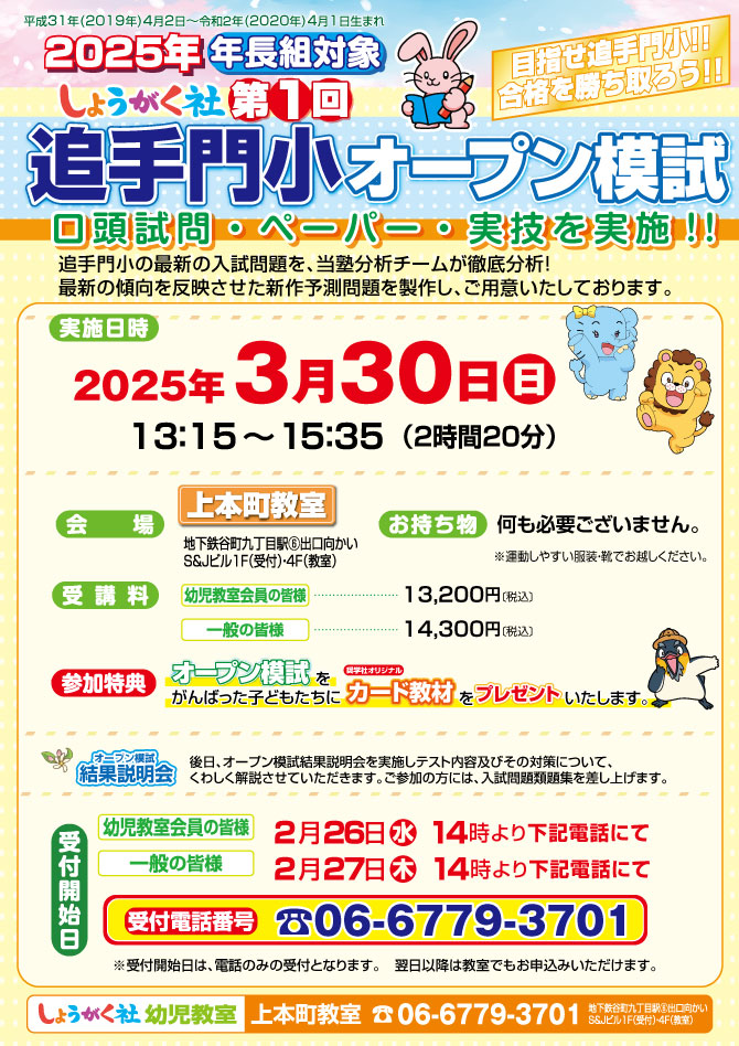 TOP >  【幼児部】トップ  >  3月30日(日)実施!『第1回 追手門小オープン模試』のお知らせ【上本町教室】