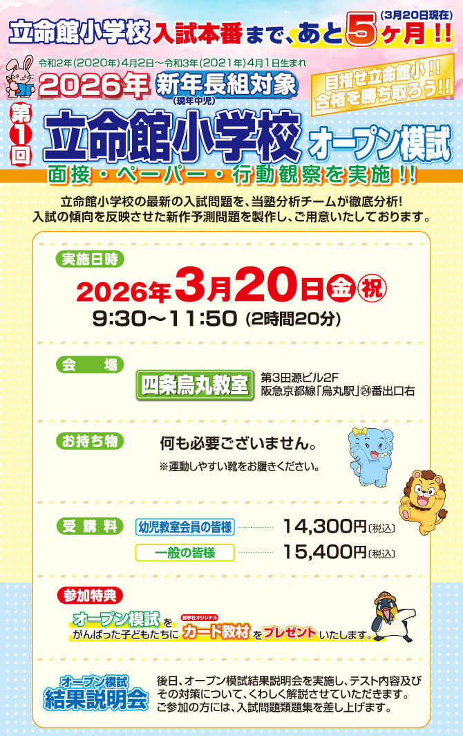 >  3月20日(金・祝)実施!『第1回 立命館小学校オープン模試』のお知らせ【四条烏丸教室】