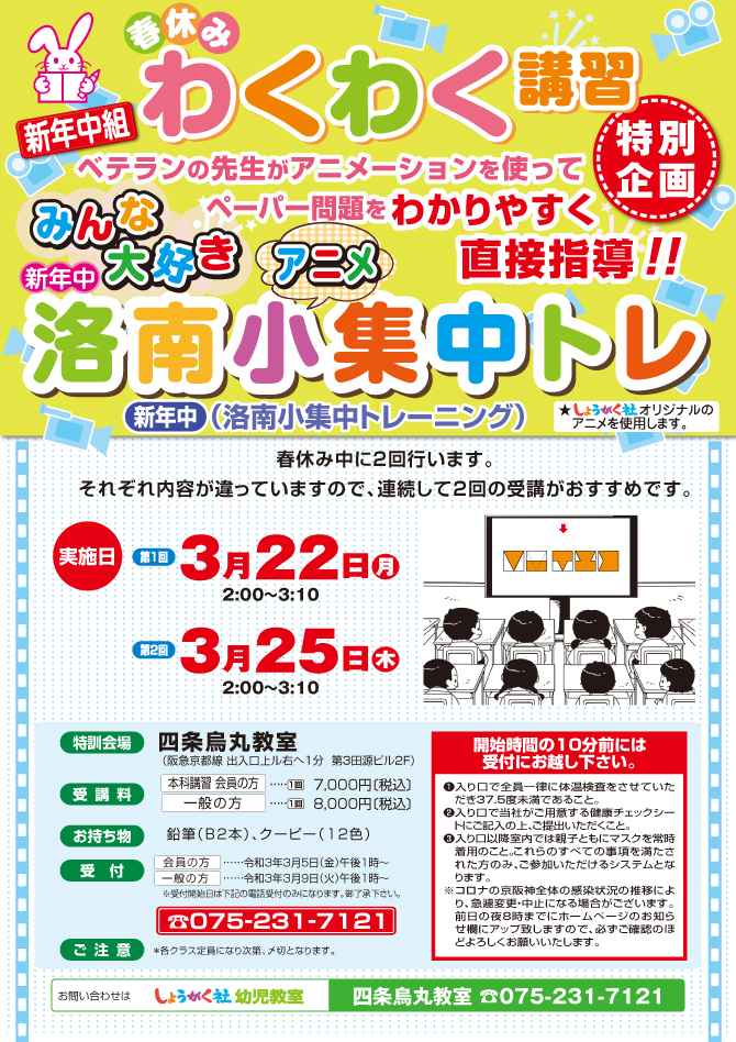 3月22日(月)スタート!!新年中対象 わくわく講習 特別企画『洛南小集中トレーニング』【四条烏丸教室】【本町教室】
