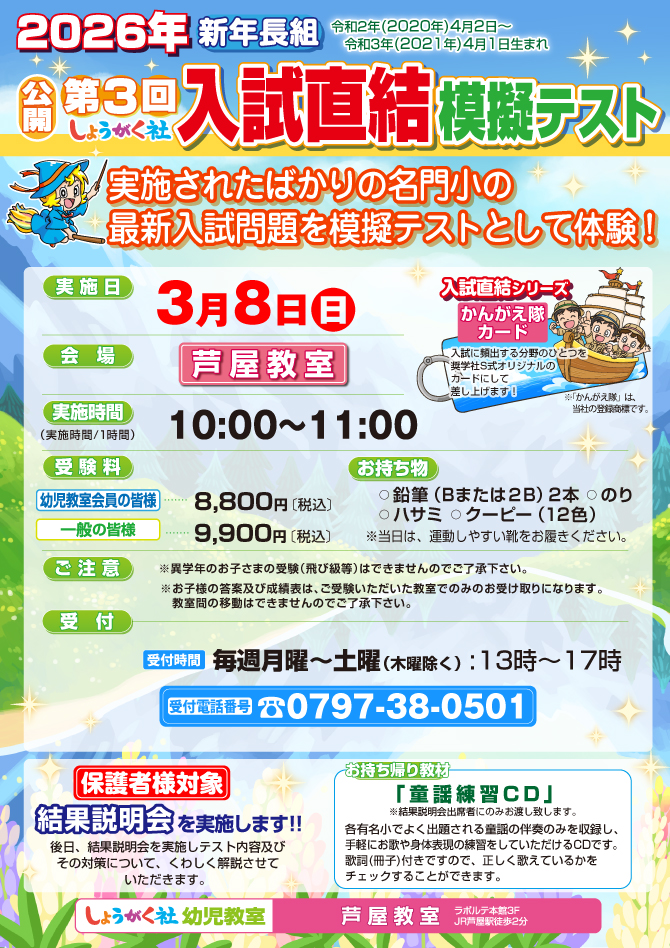 3月8日(日)同日開催!『第3回 入試直結年長模擬テスト』と『最レベ日曜クラス』のお知らせ【芦屋教室】
