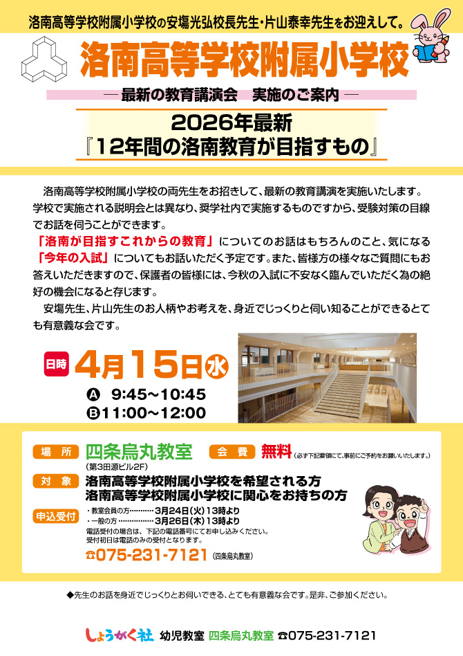 4月15日(水)実施!『洛南高等学校附属小学校 最新の教育講演会』のお知らせ【四条烏丸教室】