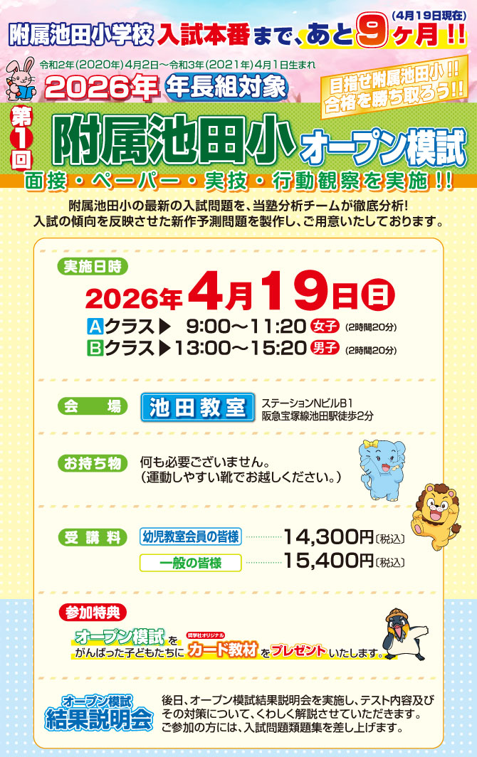 >  4月19日(日)実施!『第1回 附属池田小オープン模試』のお知らせ【池田教室】