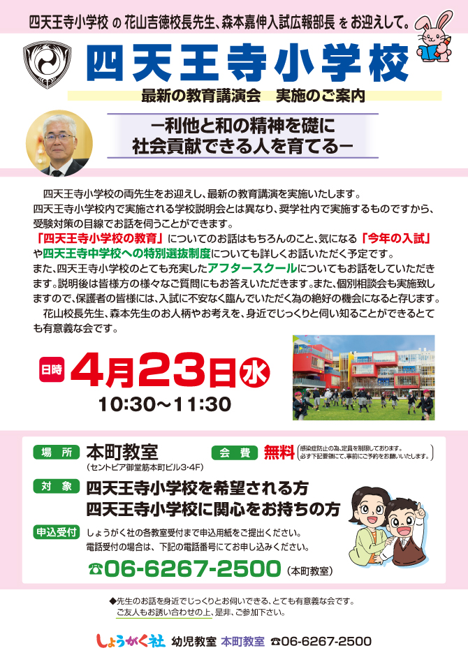 >  4月23日(水)実施!『四天王寺小学校 最新の教育講演会』のお知らせ【本町教室】
