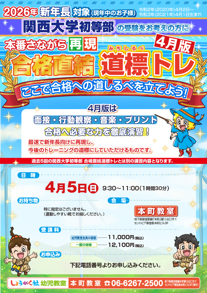 >  4月5日(日)実施!『関西大学初等部 本番さながら合格直結 道標トレ 4月版』【本町教室】