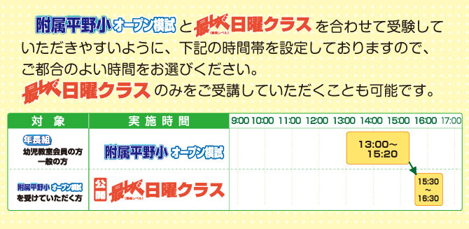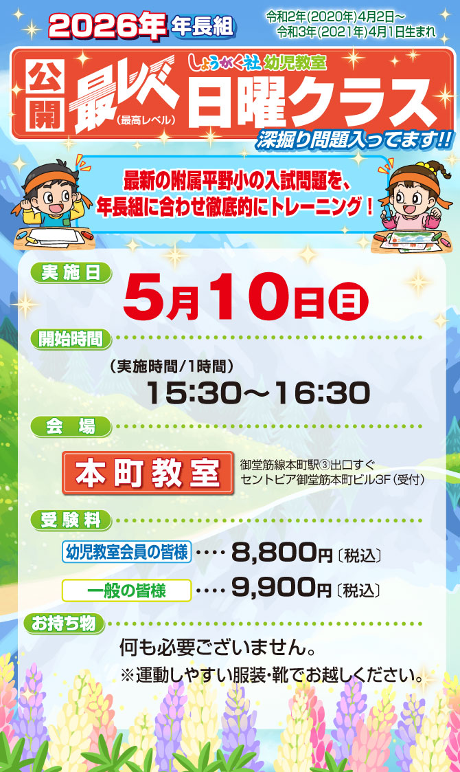 TOP >  【幼児部】トップ  >  5月10日(日)実施!『第1回 附属平野小オープン模試』のお知らせ【本町教室】