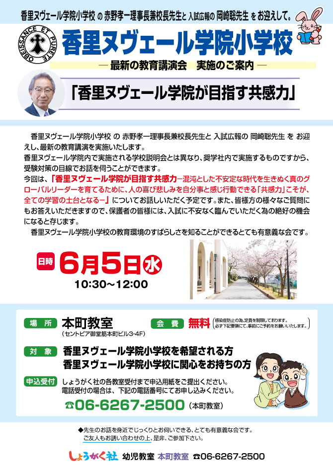 >  6月5日(水)実施!『香里ヌヴェール学院小学校 最新の教育講演会』のお知らせ【本町教室】