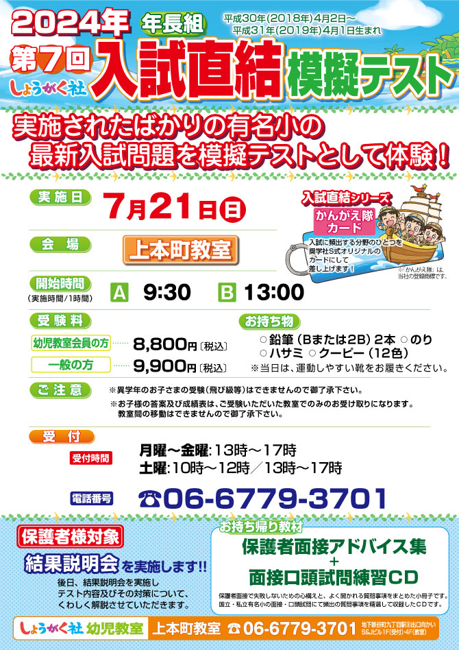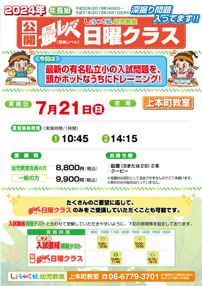 7月21日(日)実施!『第7回 入試直結模擬テスト』のお知らせ【上本町教室】 本町教室はこちら/上本町教室はこちら/池田教室はこちら/芦屋教室はこちら/四条烏丸教室はこちら最レベ日曜クラスはこちら入試直結年長模擬テスト【上本町教室】 『最レベ日曜クラス』【上本町教室】本町教室はこちら/上本町教室はこちら/池田教室はこちら/芦屋教室はこちら/四条烏丸教室はこちら