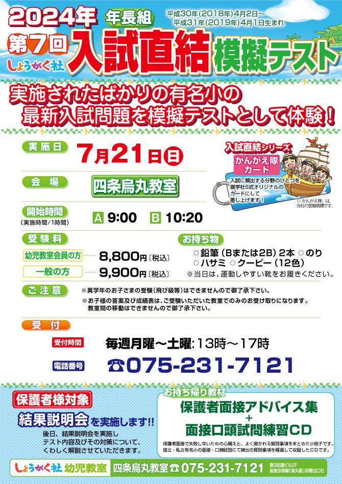 7月21日(日)実施!『第7回 入試直結模擬テスト』のお知らせ【四条烏丸教室】 本町教室はこちら/上本町教室はこちら/池田教室はこちら/芦屋教室はこちら/四条烏丸教室はこちら最レベ日曜クラスはこちら入試直結年長模擬テスト【四条烏丸教室】 『最レベ日曜クラス』【四条烏丸教室】本町教室はこちら/上本町教室はこちら/池田教室はこちら/芦屋教室はこちら/四条烏丸教室はこちら