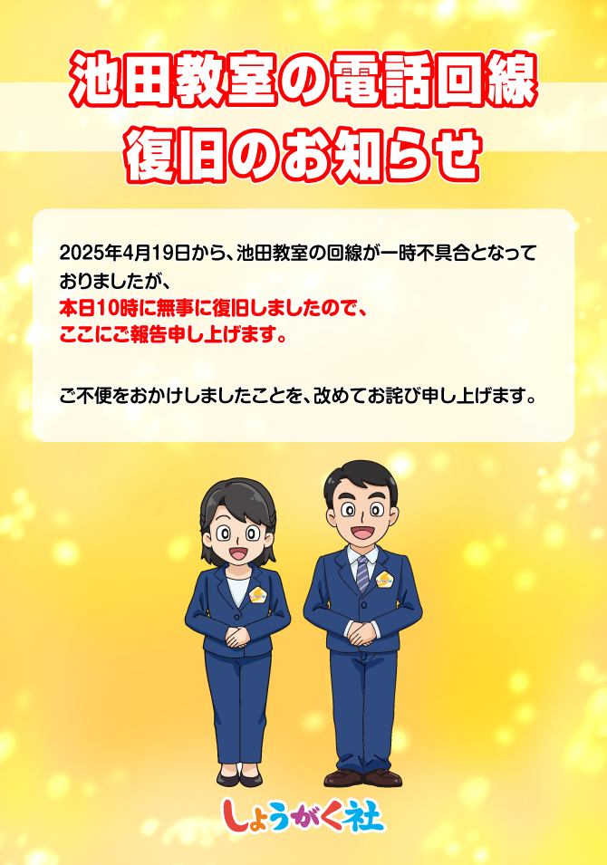 池田教室の電話回線の不具合による お知らせとお詫び