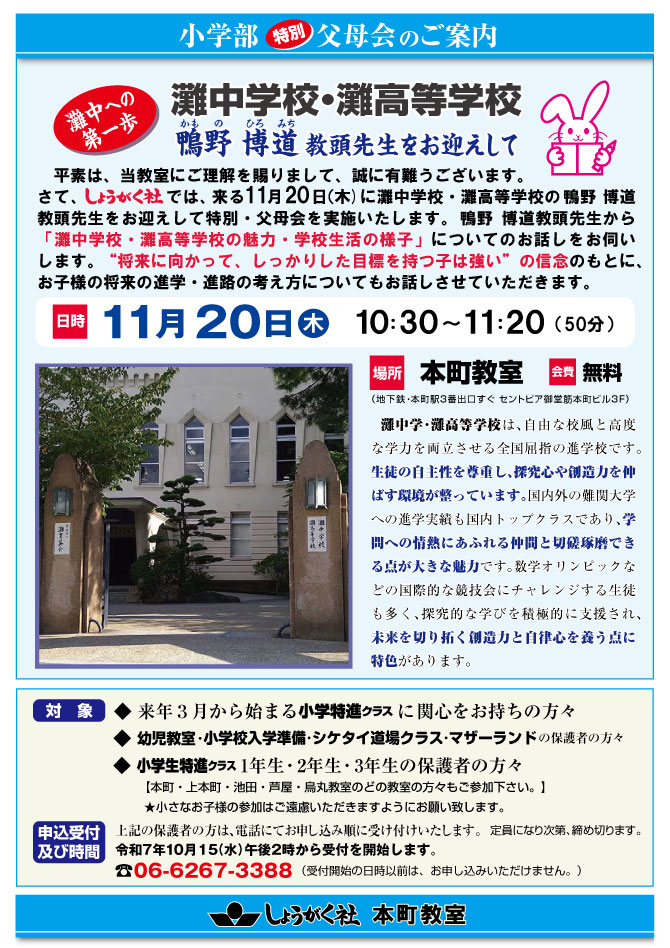 11月20日(木)実施!『小学部 特別父母会 』のご案内【本町教室】